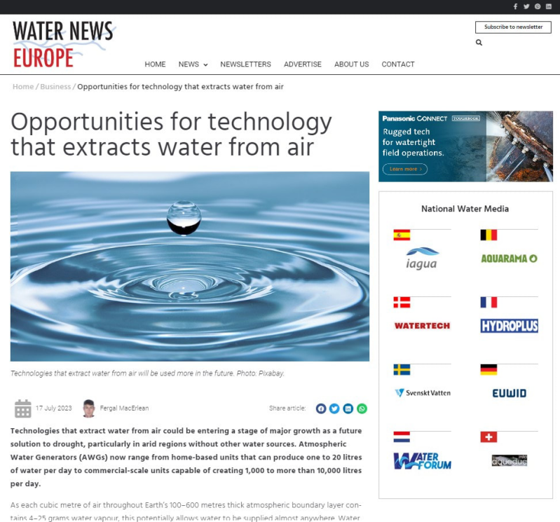 Water News Europe published this article in July 2023 outlining the present state of the water-from-air industry. Several industry sources are referenced, including Roland Wahlgren, Canadian Dew Technologies Inc. Click here to read the article.